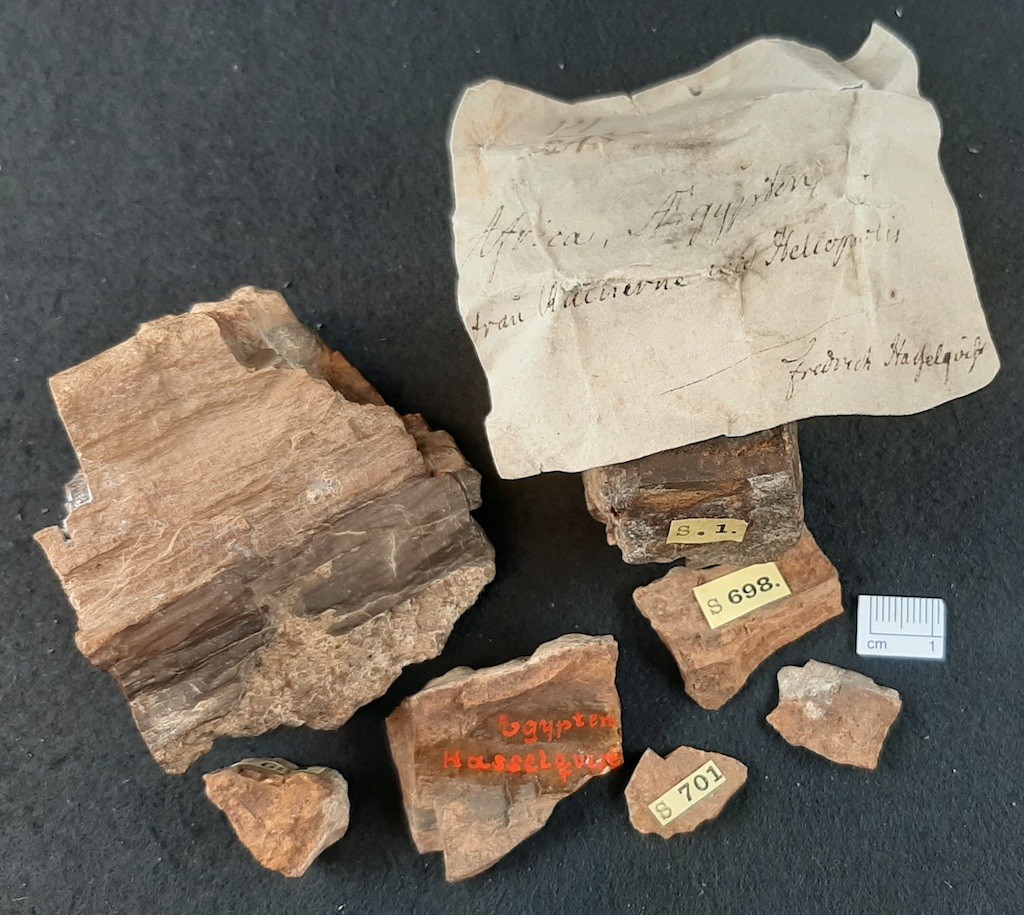 | CONTENT: | Fossil Wood collected at Heliopolis just South of the village of Matarée, today the Cairo suburb Mataria. The text on the original label, translated from Swedish, reads "Africa, Aegypt from the ruins at Heliopolis. Fredrik Hasselquist". |