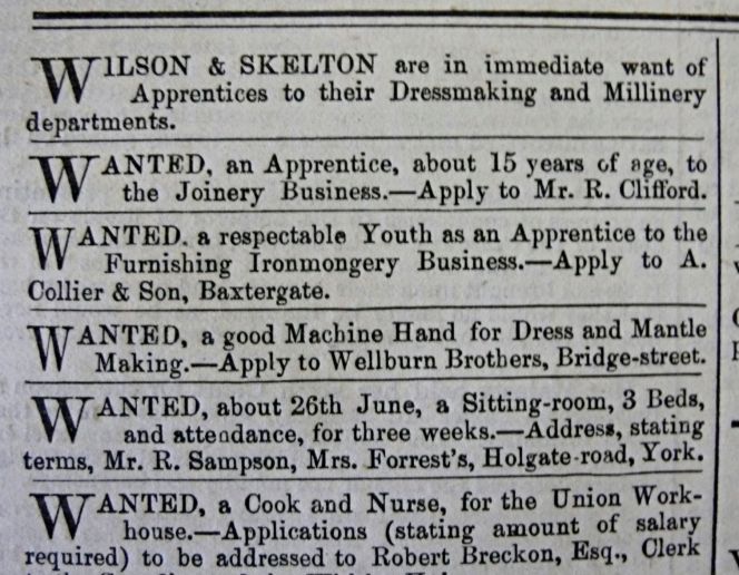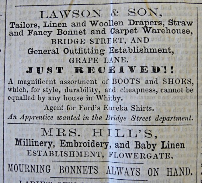 Crowdfunding CampaignBusinesses searching for new employees began placing advertisements in the Whitby Gazette as early as the 1850s, often in special ‘situations vacant’ announcements that filled long columns or, more seldom, as an addition to an advertisement for a particular firm’s products. Usually, this would be an attempt to recruit one or two apprentices, whom the advertiser hoped would be able to start work at once or as soon as possible. Often, the same advertisement reappears for several successive weeks, so it may be supposed that finding suitable people to fill the new positions was not always easy. It was not often specified whether men or women were wanted, but presumably, this was usually clearly understood. Women were needed for dress or mantle-making and as sewing maids or milliners, while drapers and tailors looked for male apprentices. This essay will examine a selection of such advertising more closely.