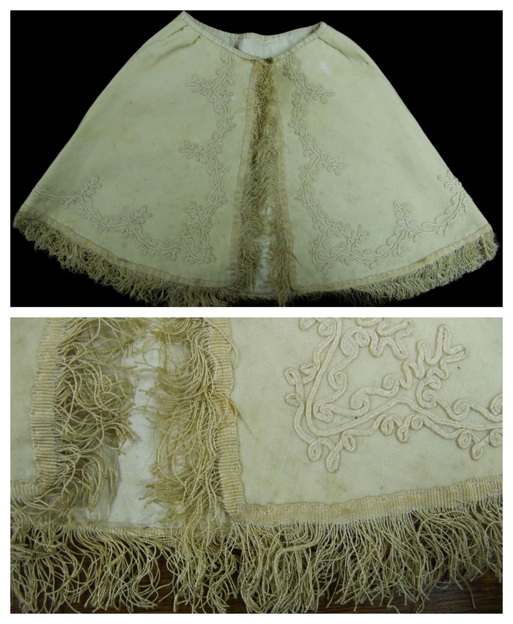 The collection also includes two christening garments that would have been especially suitable during the colder months to keep the baby warm on the way to and from the church. This illustrated item is a baby cape in fine cream-coloured wool, decorated with a silk fringe, lined with matching silk, and fastened at the neck with a hook. The decorations on this entirely hand-sewn garment feature a slender silk cord sewn into a complex festoon-shaped motif. It can be dated to the 1850s or 1860s, based on the stitching and decoration details. (Collection: Whitby Museum…, Costume Collection, GBS14). Photo: Viveka Hansen, The IK Foundation.