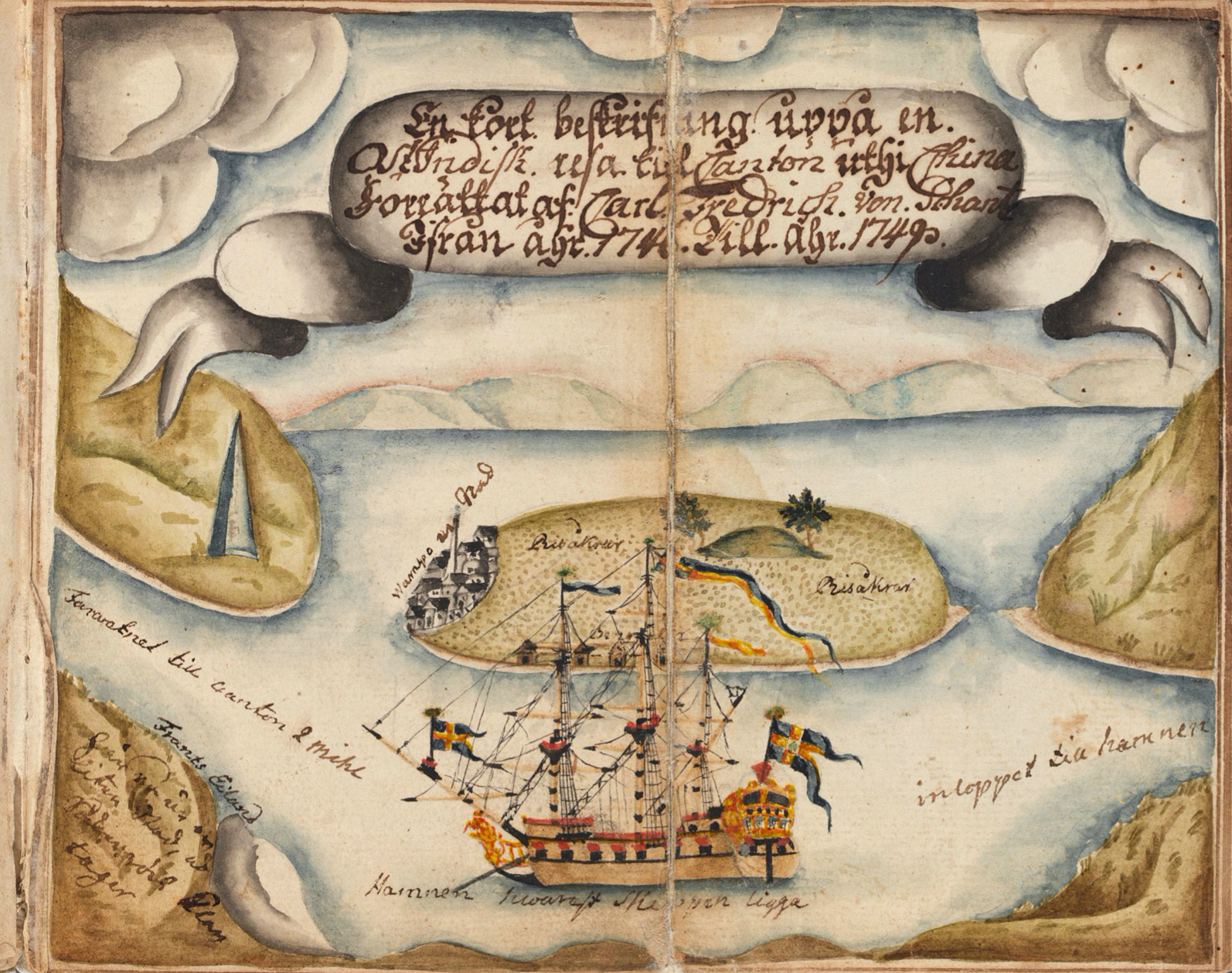 Calm waters at ‘Wampoo’ [Whampoa] in China, included as an introduction in the 19-year-old Carl Fredrich von Schantz’s East India travel journal. He was not trained in natural history, as he was an apprentice for the Admiralty on board the East India ship. However, he made a selection of natural history drawings and other depictions in watercolour, which are still pristine. These original illustrative documentations were inserted as separate plates between the copied text pages in the handwritten Swedish journal, a copied, revised version – in his own hand – due to that the first page recorded the exact return date of the voyage ’20 June in 1749’ and this introductory image with ‘the year 1749’. One motivating factor for this effort to document in the text as well as the image may have been that on the same ship – Götha Lejon – another young officer, the 18-year-old Carl Johan Gethe (1728-1765), also kept a detailed journal including watercolours. (Courtesy: Kungliga Biblioteket… M 292, p. 7).