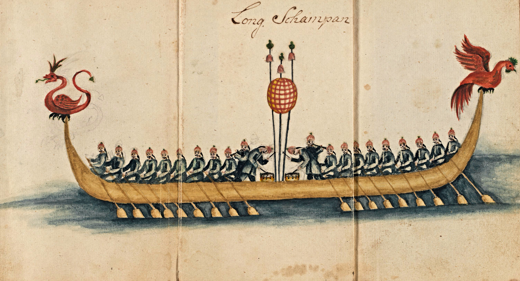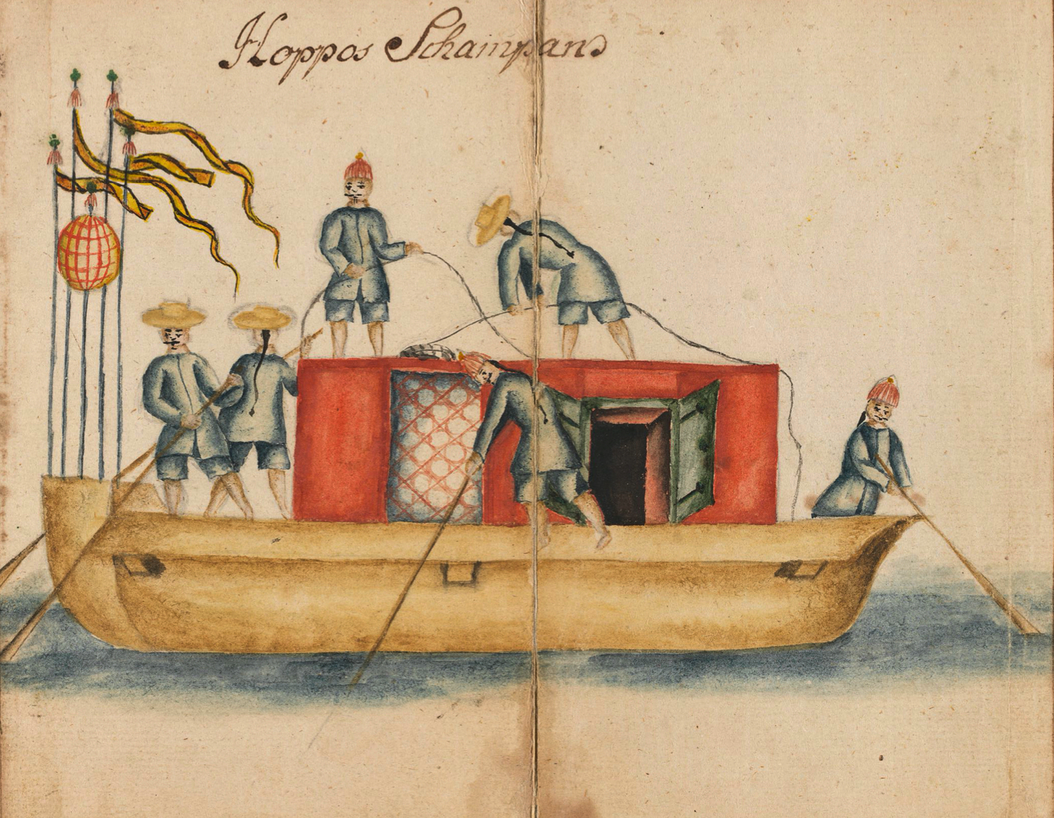 Two men wearing short coats and trousers of indigo blue fabric in a ‘Mandarin Sampan’. Watercolour by Carl Fredrich von Schantz, November 1747. (Courtesy: Kungliga Biblioteket… M 292, p. 118).