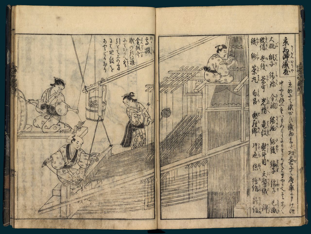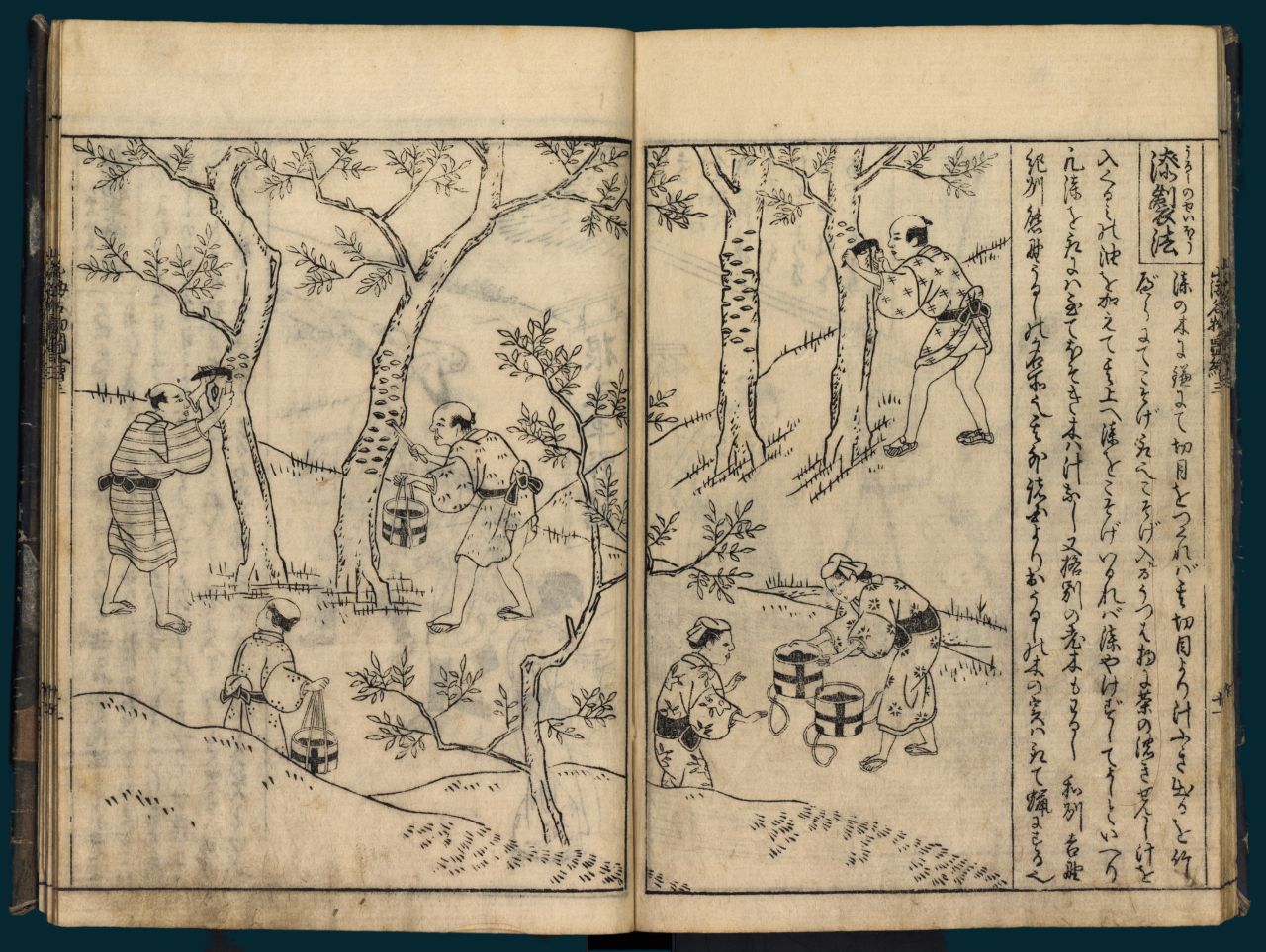 A second example from the same volume of the Japanese book set, this plate was titled ‘Collecting of varnish’. Among other uses in the country, this varnish could be applied to the surface of the paper fabric (see the two images below). Fabrics treated with wax, varnish, or oil served dual purposes. Firstly, it made the material water-repellent, and secondly, it meant that colours of poor fastness could last better if the surface were varnished. | Artist and engraver: Mitsunobu Hasegawa (1721-1755) from Osaka. (Courtesy: Uppsala University Library. Alvin-record: 91808).