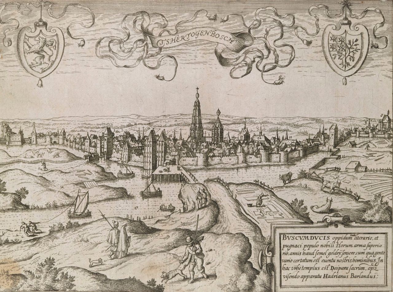 An etching of ’s-Hertogenbosch in the present-day Netherlands, dated circa 1609, shows bleaching and drying of linen clearly visible in several enclosed green fields. All these parcels of land were situated close to the walled town, possibly connected via a wooden bridge on the opposite side of the river. Cattle and dogs are fenced out to ensure that shirts and bed linens are not trampled. Judging by the long, narrow linen sheets for bleaching in some of the enclosures, it is even likely that linen was produced nearby and required bleaching grounds for their manufacturing process. Furthermore, this town was only about 100 kilometres from Haarlem, the centre of linen manufacturing, which was the most successful in this trade during the first half of the 17th century. s-Hertogenbosch was evidently part of the same extensive linen production area. (Collection: The British Library, London, UK. Etching by Cornelius Claesz, Amsterdam, part of George III’s Topographic Collection. No. BLL01004806016)