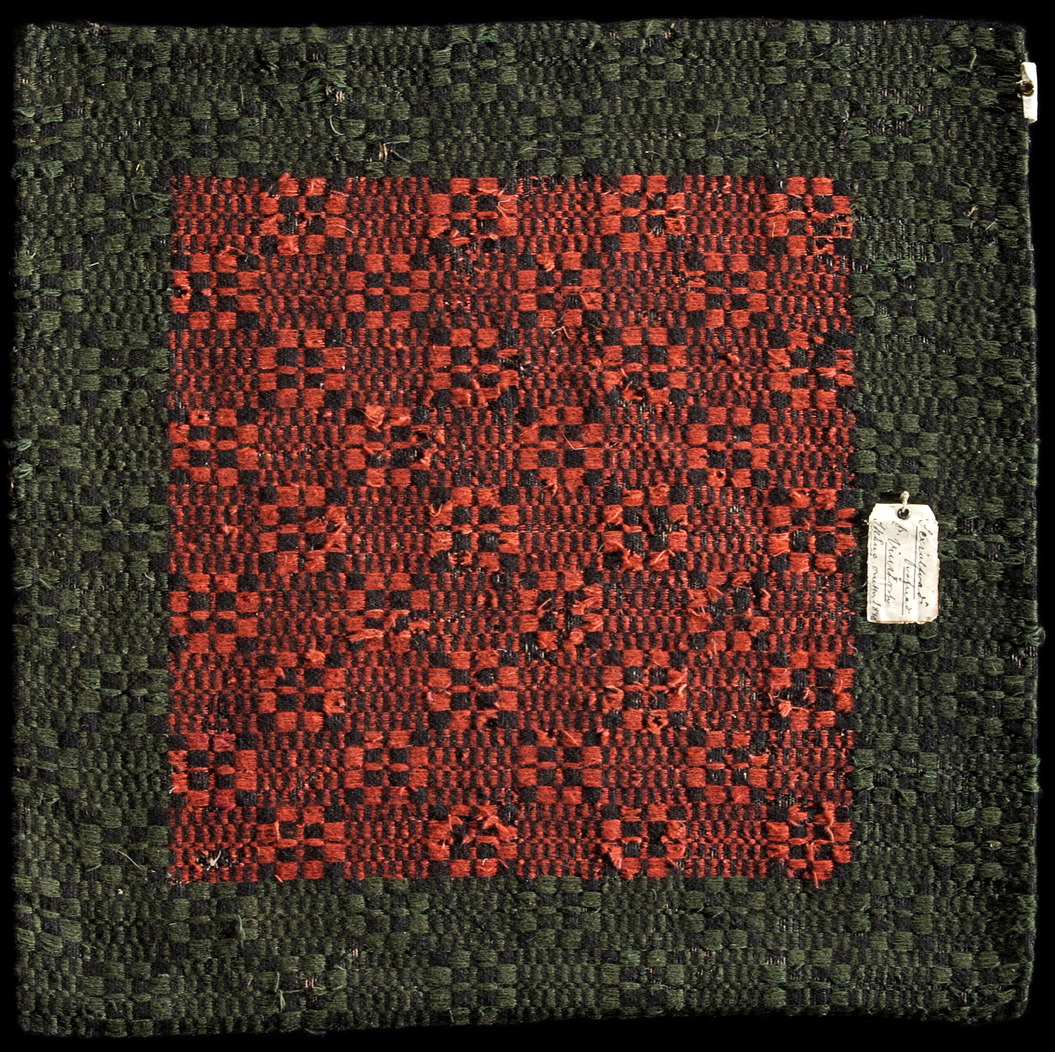 Seat cushion, woven on eight shafts, circa 1840, Bara district, Skåne province, southernmost Sweden. This “munkabälte” textile is more complex to weave than the example illustrated above. A square-shaped cushion on a linen warp – fully covered as always in this technique – has a geometrical star design across its entire surface. The centred mirror section was woven into the brocading weft due to the simultaneous use of green and red natural-dyed wool picks. In contrast to the upper and lower edges, where the brocaded weft could be shuttled with green wool only, which made this part of the weaving process quicker. It may be noted that the shuttled main weft alternates during the weaving with the picks (either shuttled or inserted by hand) and is distinctly visible in all the small black staples and cubes. The contemporary back fabric is also preserved as a handwoven twill, with a linen warp and a woollen weft. Even if both of these introduced textiles are similar in size today, the main difference is that this one was originally woven as a seat cushion with a suitable back fabric, whilst a small section from a bedcover above was remade into a pad or simply saved as a memory of a once-colourful furnishing textile. (Courtesy: The Nordic Museum, Stockholm. NM.0324905. DigitaltMuseum).