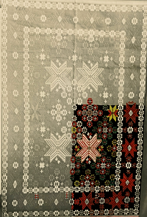 Several bedcovers of a similar elaborate design in “munkabälte”, framed with star motifs in “opphämta”, with Vemmenhög district provenance (or close to this area) in Skåne. Among other sources, as evidenced by an inventory compiled during the 1910s by the local Malmö Handicraft Organisation. These particular textiles were not marked with years or signatures. Still, according to some owners at the time who had knowledge of the weaver one or two generations earlier in their family, this design appears to have flourished in a small geographic area around the 1840s to 1860s. This partly hand-coloured photograph shows a bedcover with intricate star motifs, originating from the village of Västra Nöbbelöv, approximately 15 kilometres from the place of origin of the bedcover illustrated below, and, notably, in a nearby parish to the house-building painting depicted above. The handicraft organisation had additionally attached the equivalence of the initially used natural dyed colours in red, yellow, green, blue and undyed wool to the photograph. (Courtesy: Stiftelsen Skånsk Hemslöjd, MLH.1245. DigitaltMuseum).