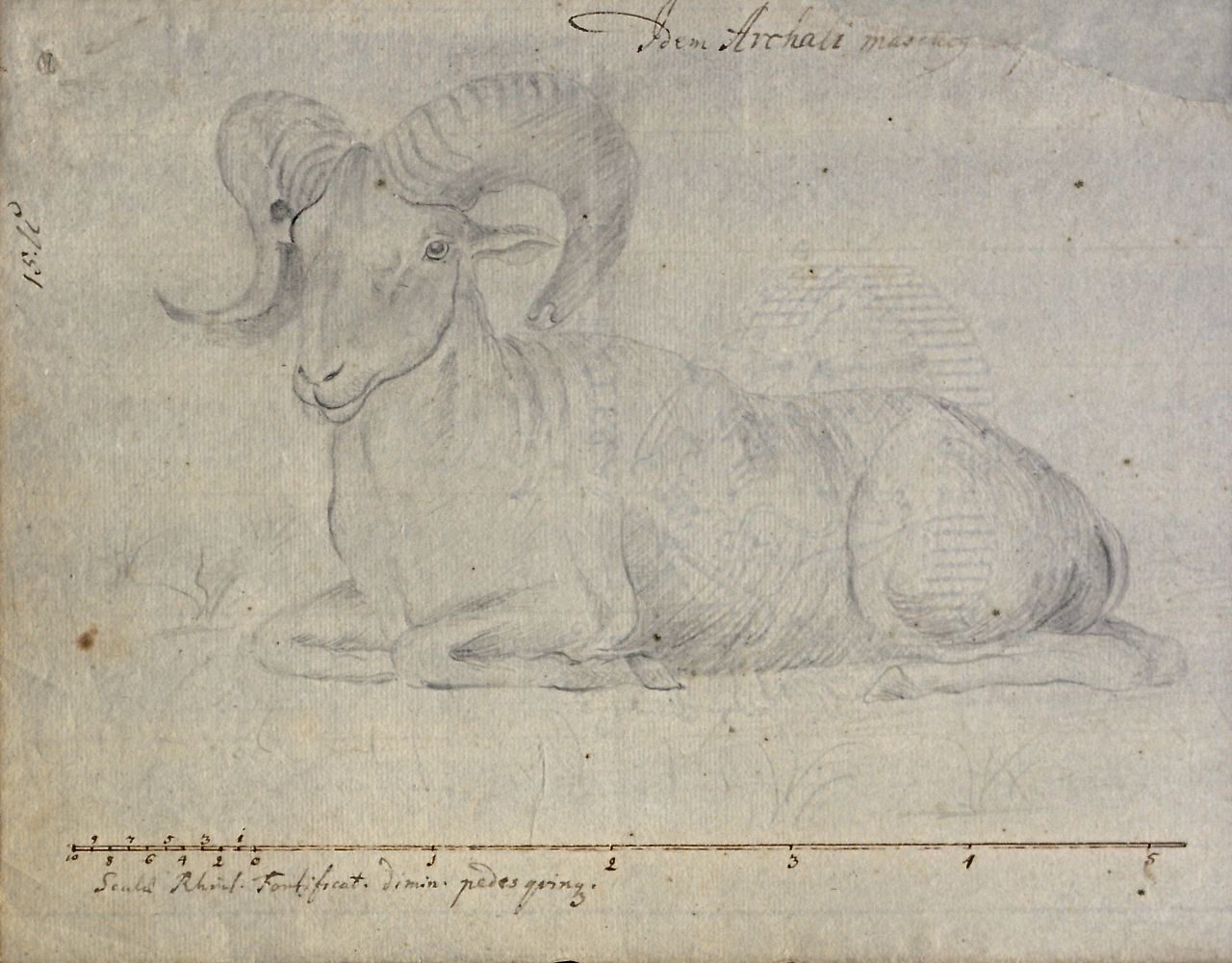 Setting out on a lengthy exploration remained tempting for Johan Peter Falck (1732-1774) during his time in St Petersburg. Despite his deteriorating health, he accepted the opportunity to lead one of the Imperial Academy of Sciences’ natural history expeditions. Several students assisted Falck — including a taxidermist, a huntsman, an artist, and from July 1770, the botanist Johan Gottlieb Georgi (1729-1802). Other travellers in the complex network of Imperial expeditions included naturalists Peter Simon Pallas (1741-1811), Samuel Gottlieb Gmelin (1709-1755), and Johann Anton Güldenstädt (1745-1781). This particular well-preserved pencil drawing was created by one of these network members, the Baltic German naturalist Johann Anton Güldenstädt (or an assistant), who was the first European to conduct a systematic study of the Caucasus – of a Caucasian mountain goat with a linear scale. (First published in Aleksandrovskaya... 2011/2014, p. 187).