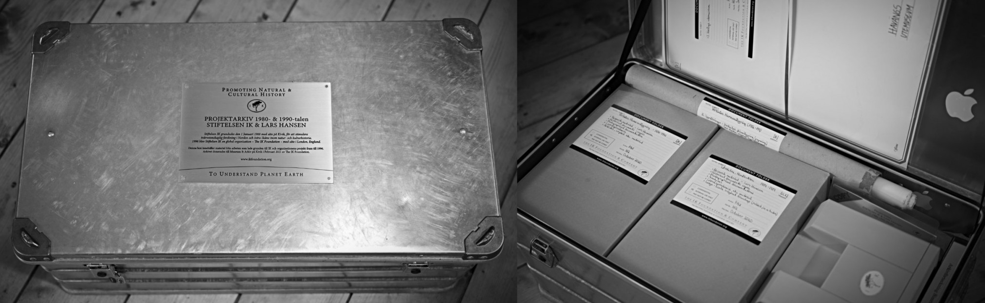 During this month (February 2021) IK has delivered the donation in a secure AluBox used in The IK Foundation's many different fieldworks around the world. The box has been crowned with a sign briefly describing the donation. The donation will be stored in the box at Kivik's museum, which will also include a full archive catalogue of the content – research material, documentation, analyses and originals from several early enterprise projects (museums, exhibitions, knowledge projects, etc.) created by The IK Foundation.